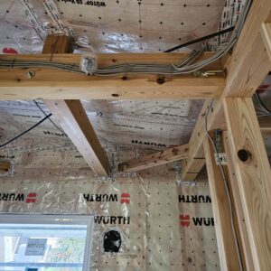 大工さんが、切れ目なく気密シートを貼り、気密テープで止め