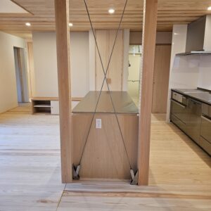 作業台の奥から筋交いがアクセントとなり空間を演出しています。